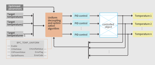 The temperature homogenization solution for the temperature control system is divided into two parts, including the homogenization decoupling and optimization part (process layer) and the PID control part (control layer). The PID control part easily ensures the processing speed. The homogenization decoupling and optimization part can ensure the uniformity of temperature coupling, including transient response, under the coupling effect of multiple temperature zones.